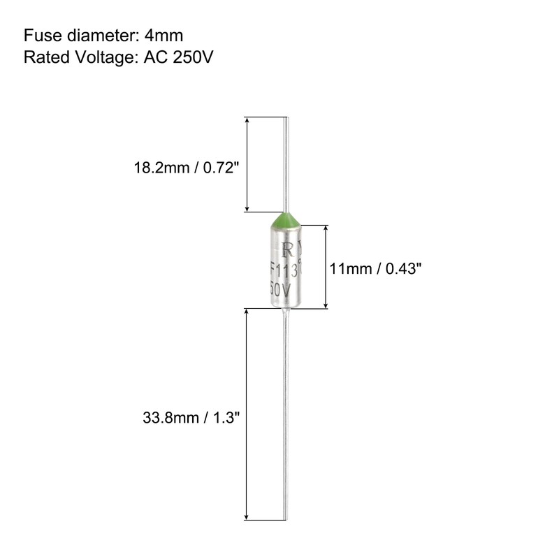- Rated Voltage: AC 250V;Rated Current: 10A;Color: Silver Tone;Fuse Size(D*L):4x11mm/0.16x0.43inch;Rated Fusing Temperature: 113 °C Celsius Degrees (235.4 °F Fahrenheit Degrees);Package Contains: 10Pcs x Metal Temperature Thermal Fuse;