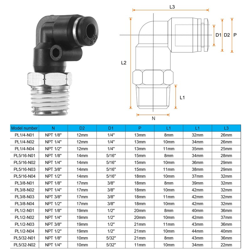 - Elbow Fittings Size - Tube OD: 5/32 Inch; Thread Size: 1/4 Inch NPT; Type: Elbow; Model: PL5/32-N1; Working Air Pressure: 0-1MPa; Maximum Pressure: 1.6MPa; Working Temperature: -40℉-140℉ (-40℃-60℃)