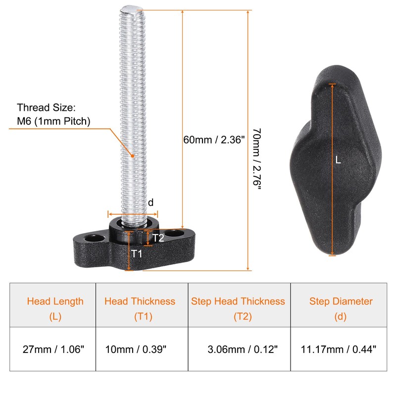 - Size - Standard Thread Size: M6 (1mm Pitch); Thread Length: 60mm / 2.36"; Tee Wing Head Size: 27mm x 13mm x 10mm / 1.06" x 0.5" x 0.39"; Step Size: 11.17mm x 3.06mm / 0.44" x 0.12"; Total Length: 70mm / 2.76"; Knob Style: Tee; Color: Black ( Threads are neat and clear, the force is even and deep, not easy to slip, and there are no burrs.)