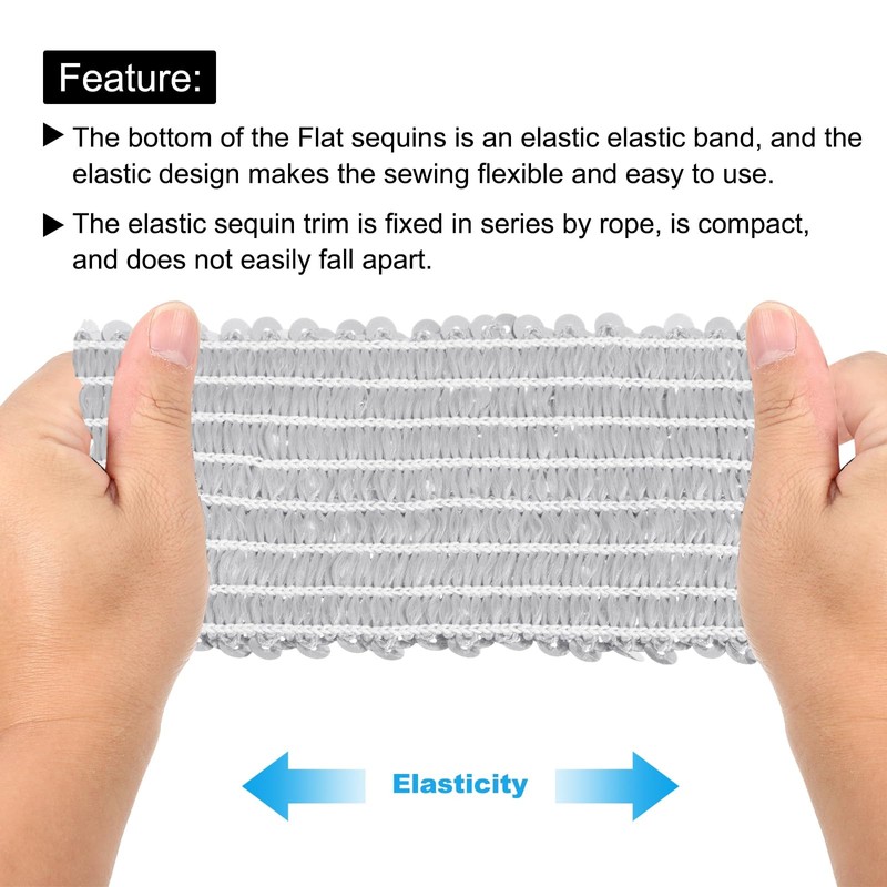 - The elastic sequin strip provides here:Color:Silver; Material: PVC; Size: 7.5cm x 11 Yards / approx. 3 Inch x 11 Yards(W*L);There are many colors and sizes for you to choose