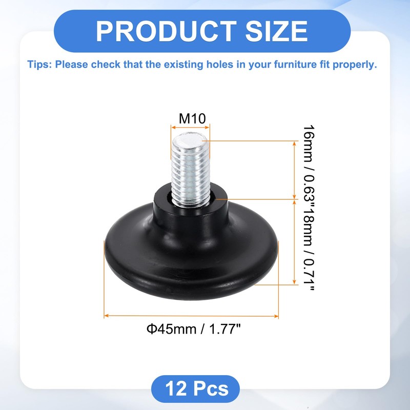 - [Size & Package]: The package comes with 12 pcs of thread furniture feet levelers with thread size of M10 x 16 mm / 0.39 x 0.63 Inch (Dia x L) and base size of 45 x 18 mm / 1.77 x 0.71 Inch (Dia x L). Please check the size before purchasing to make sure it will fit your replacement