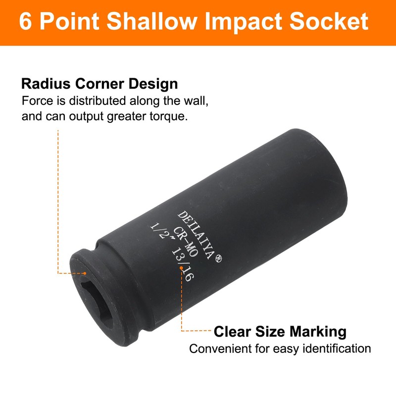 - 【Size】Drive: 1/2-inch, 6-Point Socket Size: 13/16 inch, Total Length: 78mm / 3-inch. The specifications are marked on the surface of the impact socket, which is easy to identify, improving work efficiency.