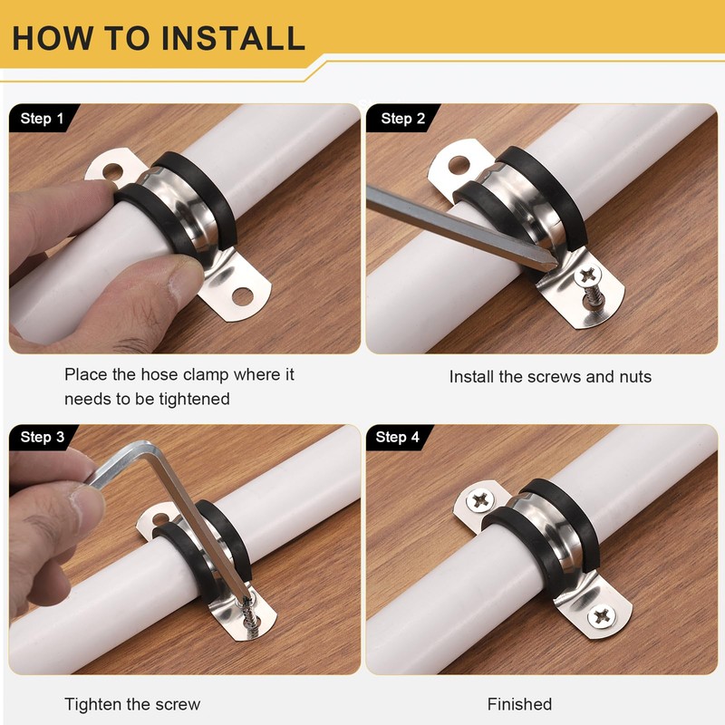 How to Install: place the cable clamp on the pipe and tighten the screws (screws not included). The flexible and stable R-shaped wire clamp allows for easy adjustment and removal. Please according to the outer diameter of the pipe to choose the pipe clamp.