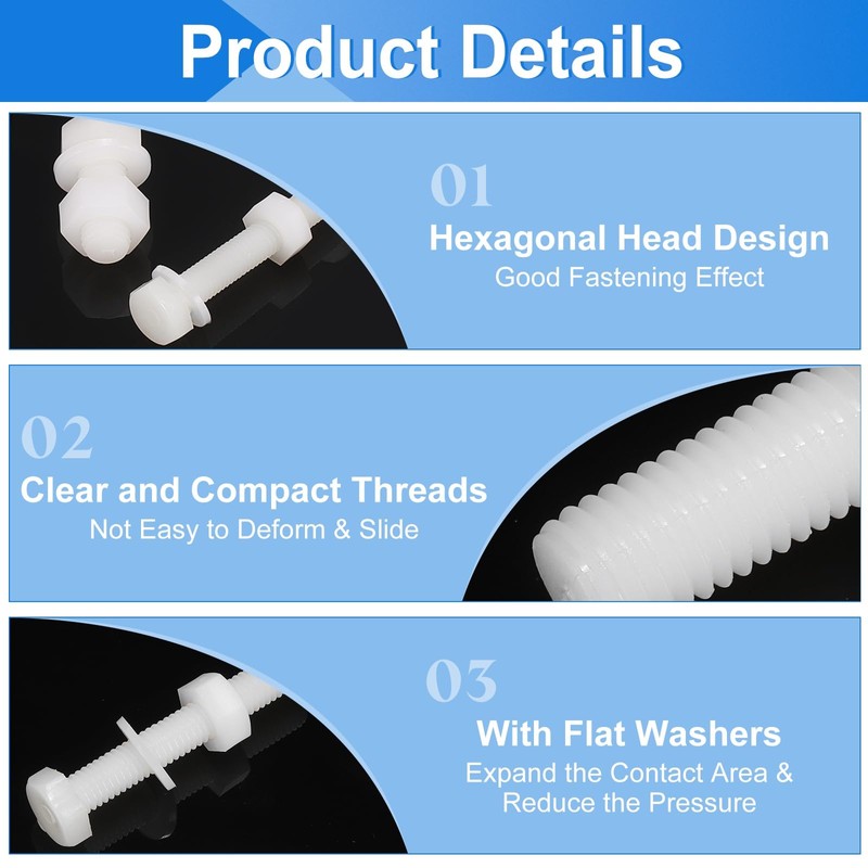 - Design: The nylon screw sets are a fastening component with a hexagonal head design, which has a good fastening effect. The clear and compact thread makes it not easy to get out of shape and slide in the rolling process. Due to the special material of nylon, it will not interfere with the signal of electronic equipment, also suitable for places that require non-conductivity