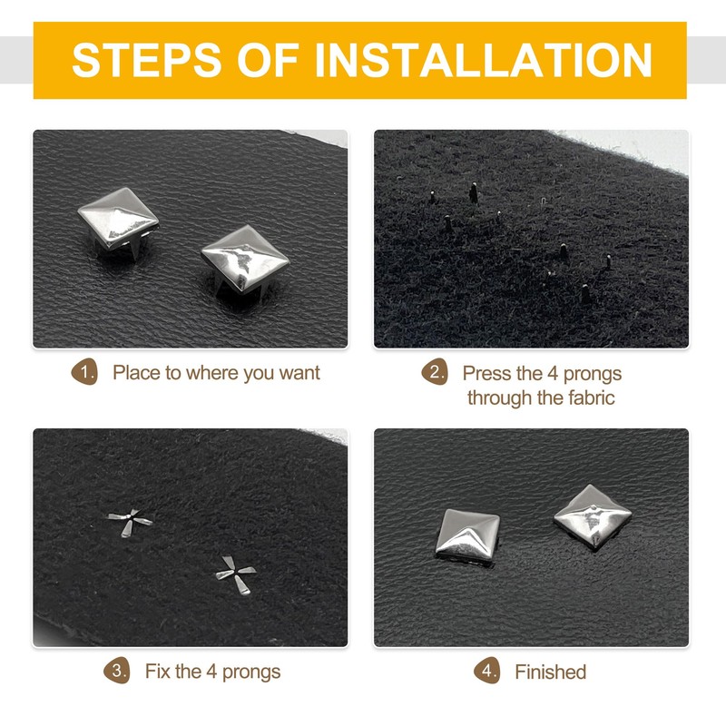- 4-Jaw Pyramid Design: The pyramid shape of these studs adds a fashionable touch to any project. Whether you are embellishing clothing, bags, shoes, or DIY crafts, these studs will elevate your designs with their modern appeal.