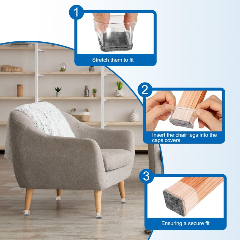 • Easy to Use: To use these chair leg floor protectors, simply stretch them to fit greatly, and insert the chair legs into the caps covers, ensuring a secure fit, and the felt bottom should be in contact with the floor surface to provide optimal protection. It is recommended to clean the chair legs and floor surface before installation for better adhesion.