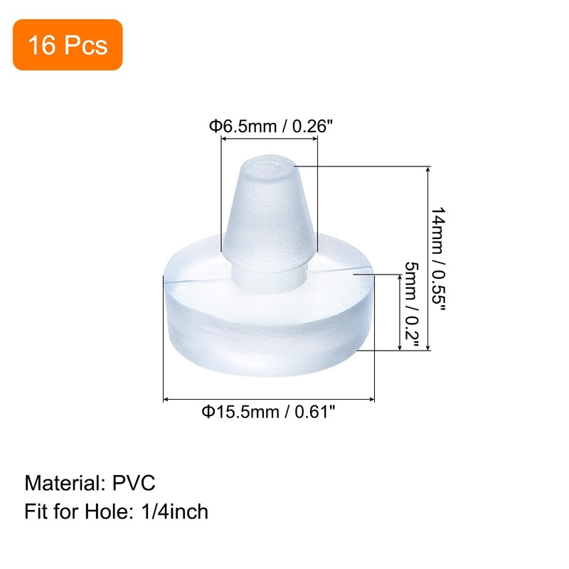 - What You Will Get: 16Pcs of bumpers to meet your various needs, Color: Clear, Stem Diameter: 6.5mm/0.26inch, Fit for Hole:1/4inch, Bottom Thickness: 5mm/0.2inch, Overall Size: 15.5x14mm/0.61x0.55inch(OD*H).