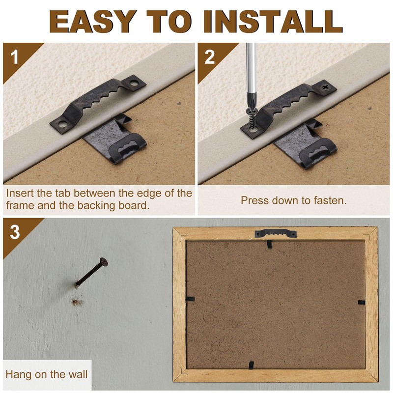 - [FEATURE]: The picture hanging hardware is designed to firmly fix photos or pictures on the wall or shelf. It not only firmly attaches to the back of the photo frame to ensure that the photo frame will not easily loosen or slip, but also effectively prevents it from falling off due to external impact or other factors. You can display your photos or works without worrying that they will suddenly fall off the wall