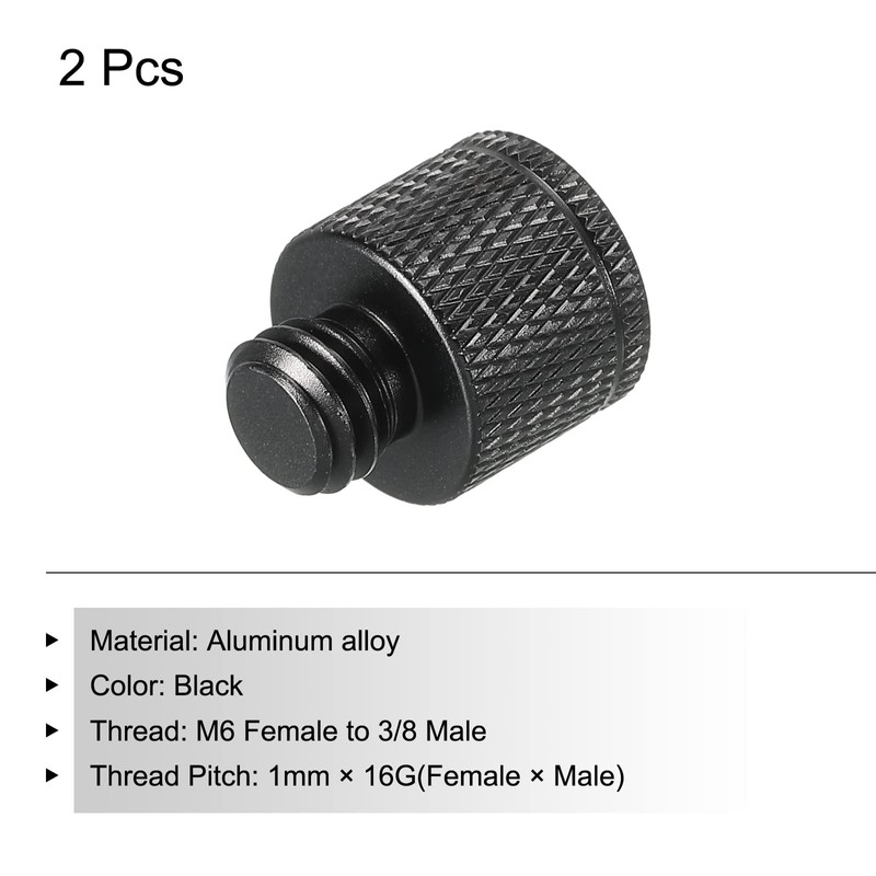 - Camera screw threads we offer here are in the size of: material: aluminium alloy; colour: black; body height: 13 mm / 0.59 inches; thread: M6 female to 3/8 male; thread spacing: 1 mm x 16 g (female x male), total size: 16 mm x 20 mm / 0.63 x 0.79 inches (D x H)
