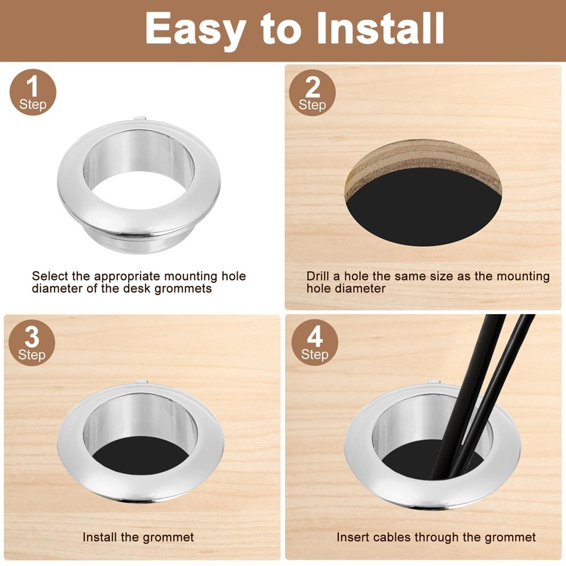 - Easy Installation: Measure the diameter of the table hole, select the appropriate Mounting Hole Diameter of the Desk Grommets, and press them firmly into the closure to complete the installation.
