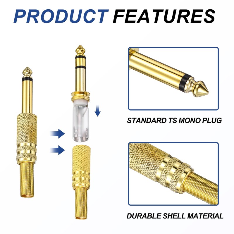 • Great Compatibility: This TS audio cable plug with standard 6.35mm (1/4") design, which could adapt to most audio devices that equipped with TS mono jack, very suitable for audio cable production. Outstanding Conductivity: Made from copper gold plated material, which ensures excellent power conductivity, providing a stable and efficient sound signal transmission. Versatile Use: This TS male plug is very suitable for producing TS audio cable for devices like microphone, guitar, speaker, etc