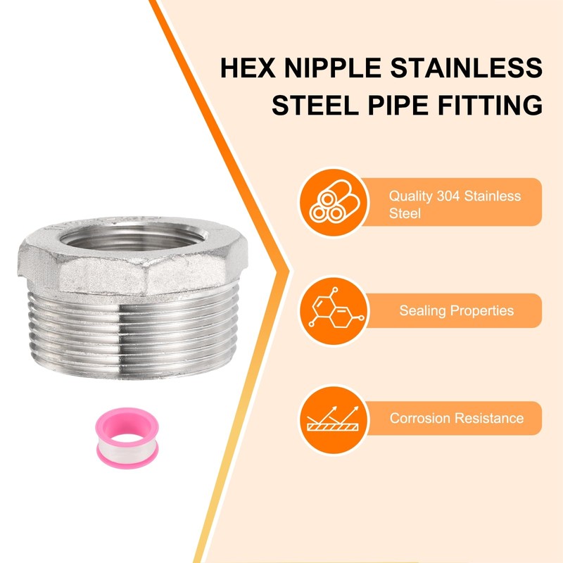 sourcing map 2 Pcs 304 Stainless Steel Reducer Hex Bushing G1-1/2 Male x G1 Female Threaded Reducing Pipe Adapter Fitting with PTFE Tape for Plumbing, Fuel Lines, and Pneumatic Systems