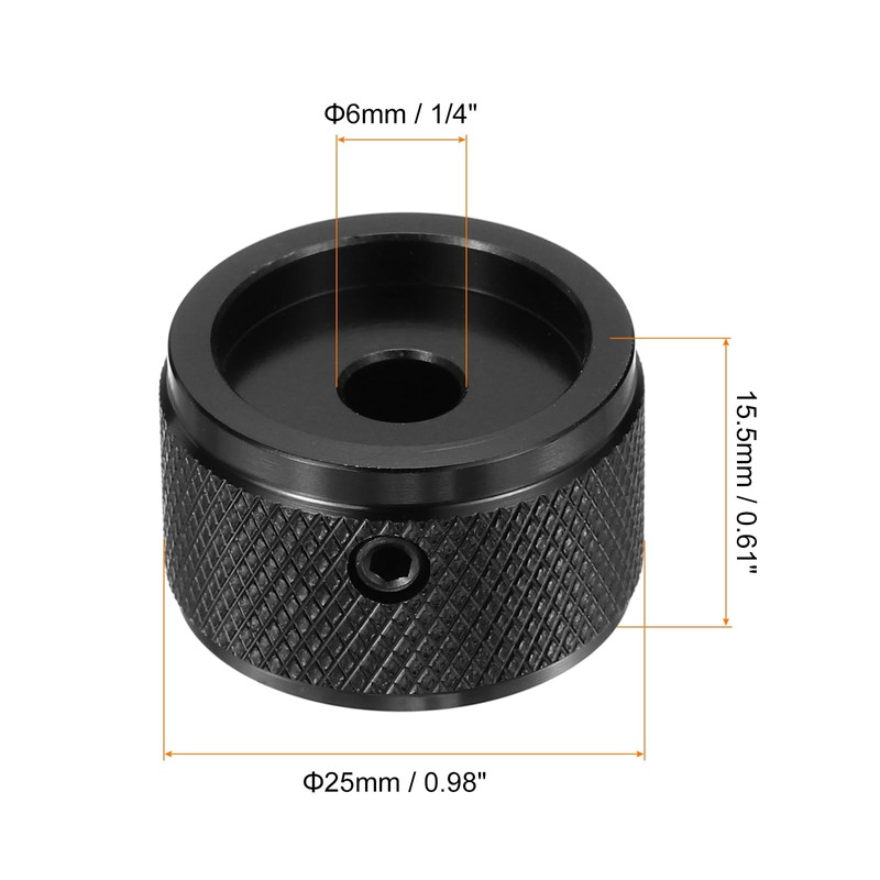 - Aluminium Alloy Potentiometer Knob: Size: 25 x 15.5 mm / 0.98 x 0.61inch (OD x H); Material: Aluminium Alloy; Mounting Hole Dia: 6mm / 1/4 inch; Color: Black;