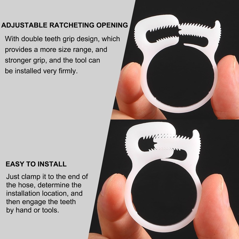 - [Easy to Install and Reusable] - The hose clamps have a double grip of teeth, so it is easy to install and replace. Just clamp it to the end of the hose, determine the installation location, and then engage the teeth by hand or tools.