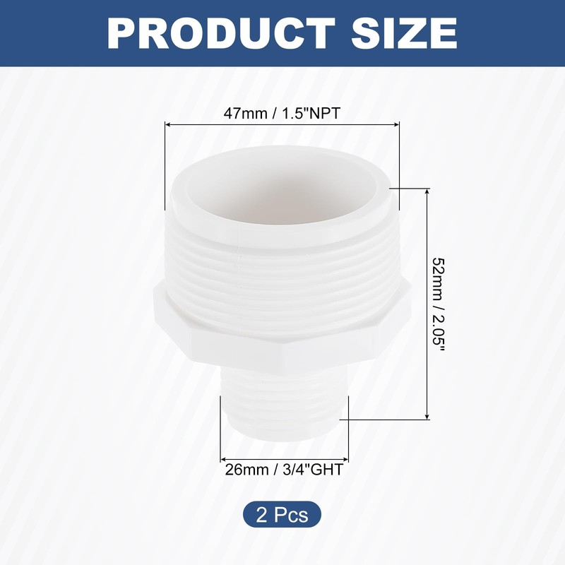 - [What You Get] - The package comes with 2 pcs of plastic garden hose adapter. Thread Size: 1.5" NPT x 3/4" GHT(47mm x 26mm); Length: 52mm/2.05".Note: GHT and NPT are different types of threads, please confirm which adapter you need before purchasing.