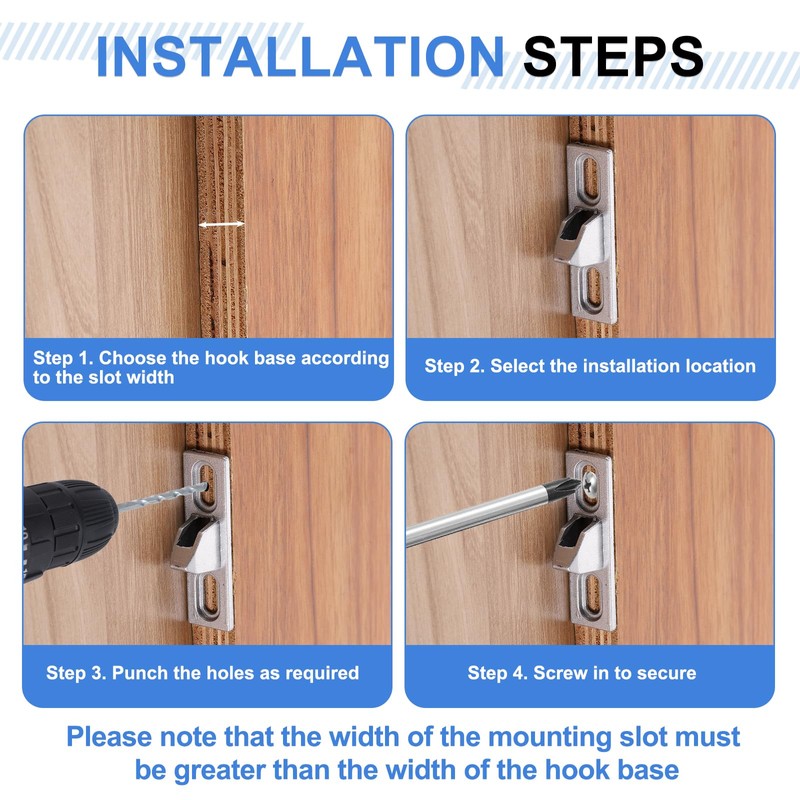 Easy to Install - The sliding door latch is easy to install. It comes with mounting screws. Choose the hook base according to the slot width, select the installation location, punch the holes as required, and screw in to secure. Please note that the width of the mounting slot must be greater than the width of the hook base.