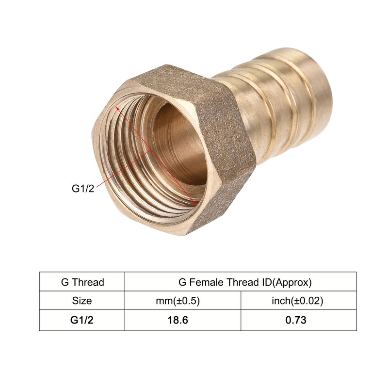 Internal thread: G1/2 (approx. ID 18.6 mm)< br>Outer diameter of barb: 16 mm / 0.63 inches.