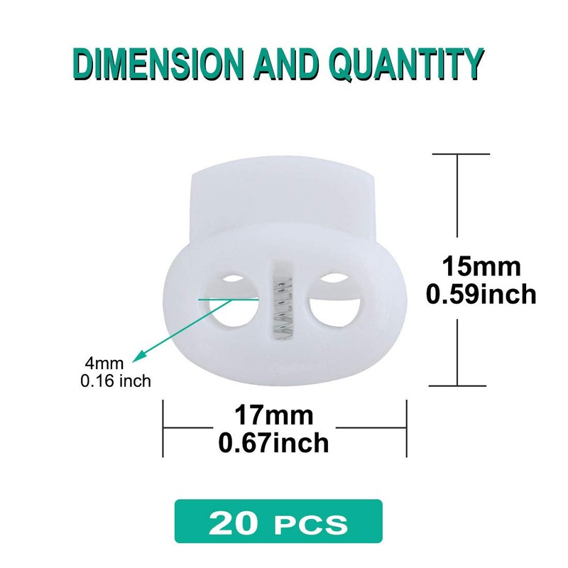 - PACKAGE INCLUDES - 20 PCS Double Hole Spring Cord Locks; Cord Hole Size:4mm/0.16"; Total Size:17 x 15 x 6mm/0.67" x 0.59" x 0.24"(L*W*T); Great for craft usage, can meet your needs for DIY