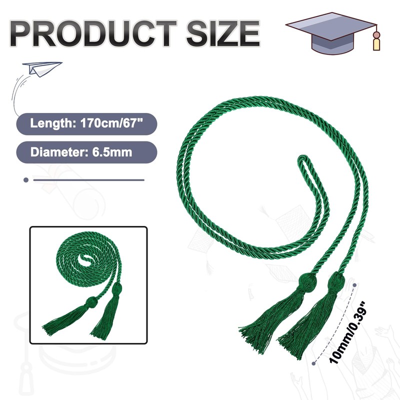 - The graduation tassel we provide here is in size of Length: 170cm/67 Inch; Diameter: 6.5mm; Color: Purple; Material: Polyester; In the package of: 1Pcs x Purple tassels.