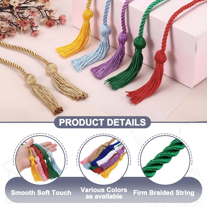 - This 2025 graduation tassel is formed by weaving and winding multiple slender polyester threads together, presenting a tassel-like appearance. Usually draped over the shoulders, tassels mean academic achievement and honor, adding a festive and academic atmosphere to the entire graduation decoration ceremony scene.