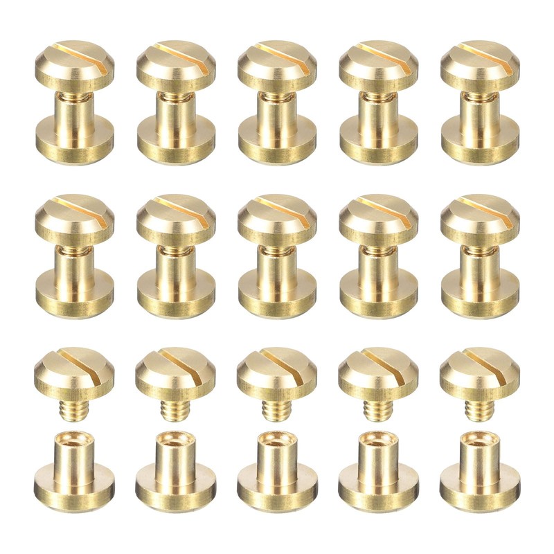 - [Chicago Screw Rivets] - Screw Type: Slotted; Shape: Concave Round Head; Base Diameter: 10mm / 0.39-inch; Screw Size: M4 (4mm/ 0.16-inch); Post Rod Length: 4mm / 0.16-inch; Total Height: 10mm / 0.39-inch; Package: 20 Sets Chicago Screw Rivets