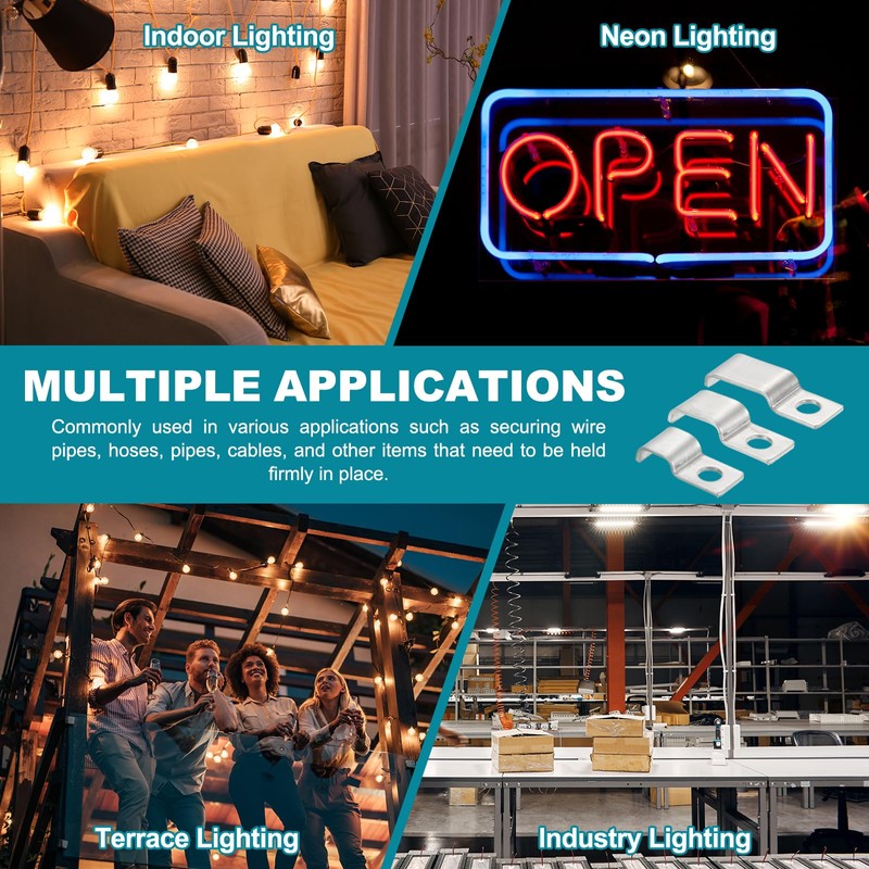 - These one-hole design conduit strap clamps can be easily installed and removed. Select the inner height of the corresponding pipe clamp according to the outer diameter of the pipe/cable, determine the hole position and fix the screws to secure it onto most surfaces.