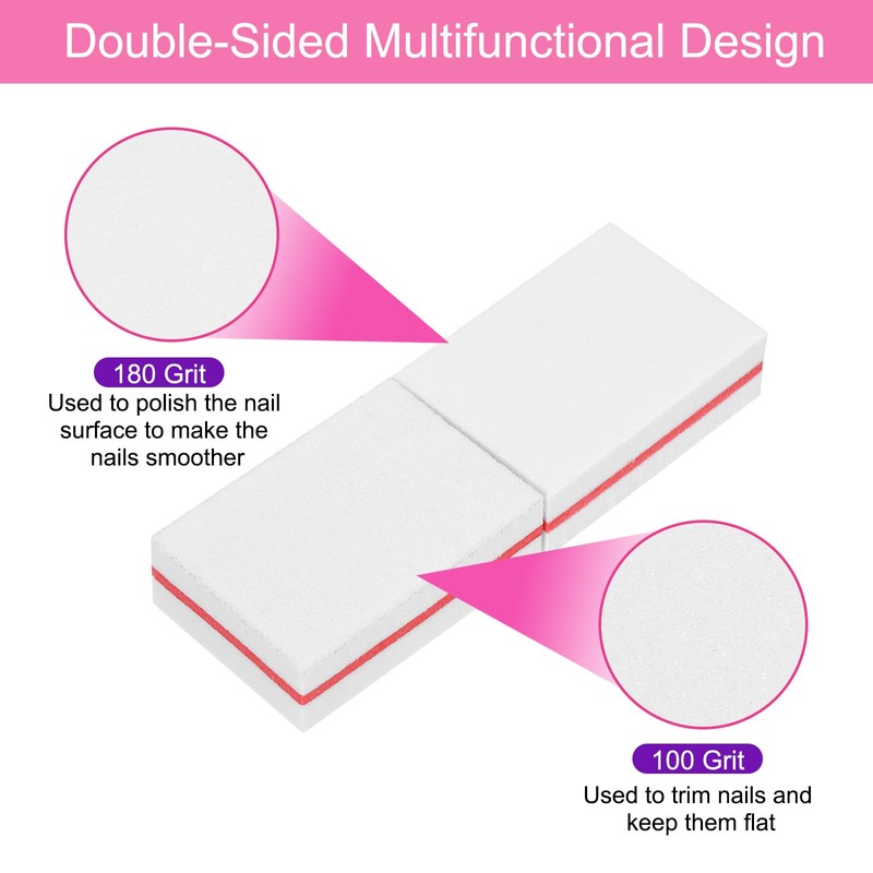 - Feature - The double-sided design combines two different grits of 100 and 180. The 100 grit is used to trim nails and help remove uneven parts, and the 180 grit is used to polish the nail surface to make the nails smoother. It can complete multiple care steps at one time, improve care efficiency, and make nail care more efficient. The small size is easy to carry; it is more flexible to use and can complete more detailed nail care.