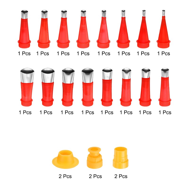 - Size - The package contains 16 different sizes of caulking nozzles of 5mm, 6mm, 7mm, 9mm, 10mm, 12mm, 13mm, 14mm, 16mm, 18mm, 20mm, 22mm, 25mm, 26mm, 28mm and 30mm, with 6 connection bases. There are clear specification markings on the surface of caulking nozzle set for easy identification and use. You can choose the appropriate model to use as needed.