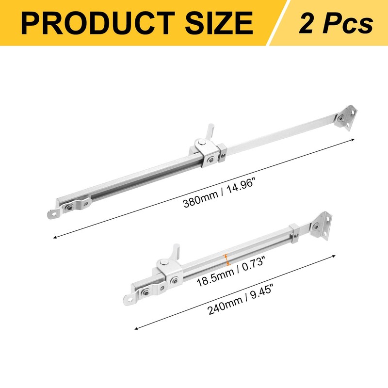 • Material: Stainless Steel; Colour: Silver; Retractable Length: 380mm / 14.96"; Thickness: 2.5mm / 0.1"; Base Width: 18.5mm / 0.73"; Opening Angle: 120°; Stowed Length: 240mm / 9.45"; Package Content: 2Pcs x Window Hinges (8Pcs x Cross Self-tapping Srews)