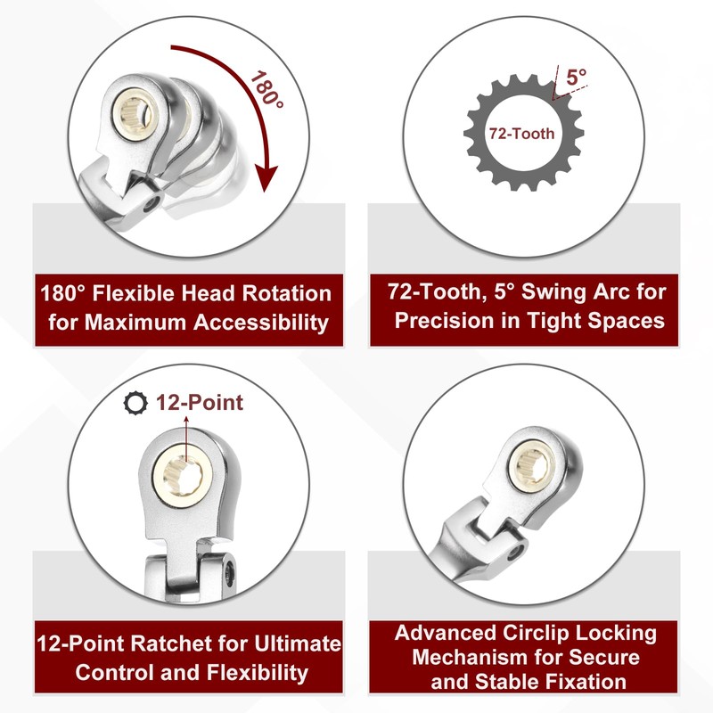 - Feature - The flexible box end design, with a 180° rotation angle, allows for quick and precise tightening and loosening operations in tight spaces, improving operational flexibility. The 72-tooth ratchet has a swing angle of only 5°, allowing for fine and accurate operation, improving operational precision. The 12-point box end design ensures a tight fit, and a stable connection, and prevents slipping during operation.