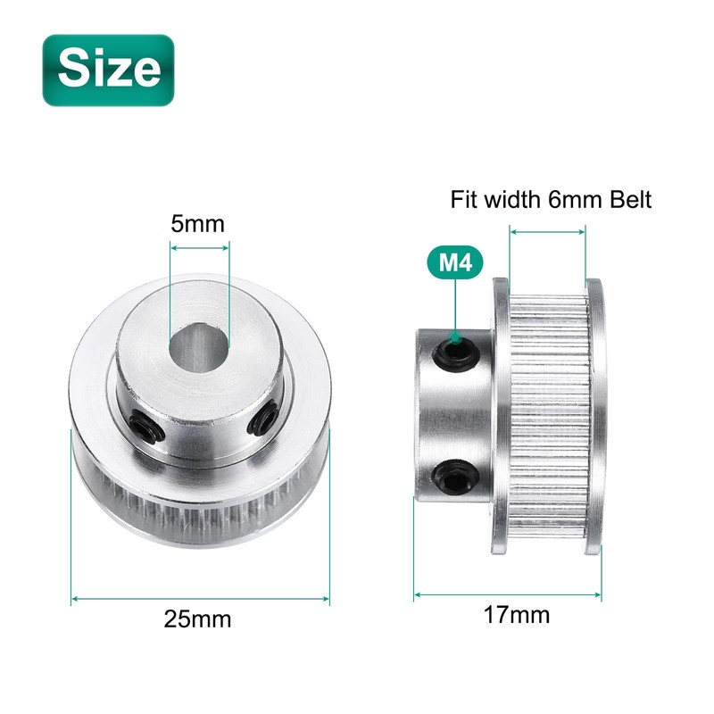 - Package Contents: You will receive 2pcs 5mm bore pulley, 4pcs M4 screws. (Pulley Dimension: OD 25mm x Height 17mm)