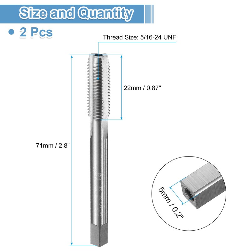 - Hand Threading Tap Size: Thread size: 5/16-24 UNF; total length: 71mm / 2.8"; thread length: 22mm / 0.87"; square end width: 5mm / 0.2"; accuracy class: 2B. Right hand thread cutting, fast tapping with accuracy.