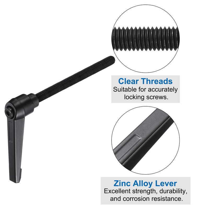 - Adjustable Lever Handles: Standard metric thread dia.: M8 (1.25mm Pitch); thread length: 80mm / 3.15"; lever length: 59mm / 2.32". The handles are particularly useful when the lever has a limited turning angle, making them perfect for applications that require frequent and quick adjustments and when working in confined areas.