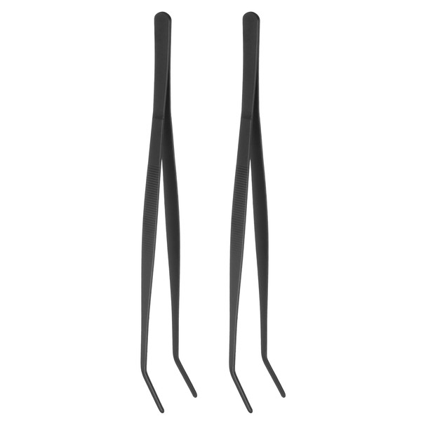 sourcing map 2pcs Long Tweezers 11.8 Inch Stainless Steel Tweezers with Curved Serrated Tip Multi-Purpose Kitchen Tongs for Cooking Gardening Repairing Craft, Black