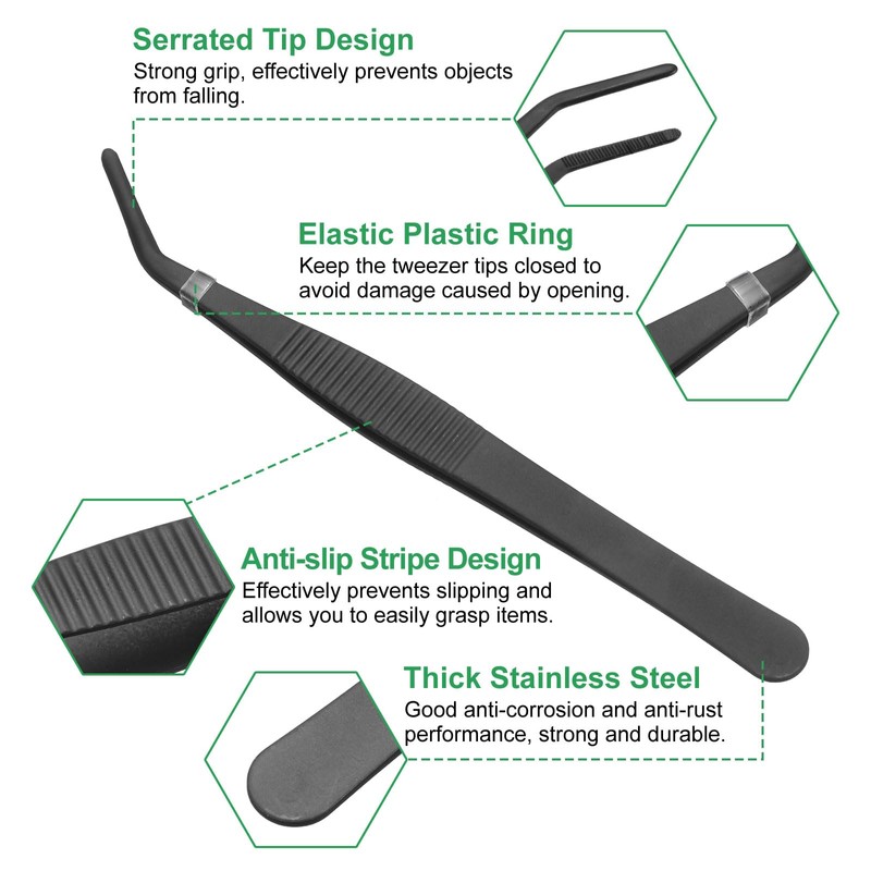 - Feature - Designed with a serrated tip, these tweezers deliver a firm hold on various objects, while the ergonomic handle with a non-slip texture ensures comfortable and stable use. The included elastic plastic ring acts as a temporary lock to keep the tweezer tips closed when not in use, preventing damage from opening.