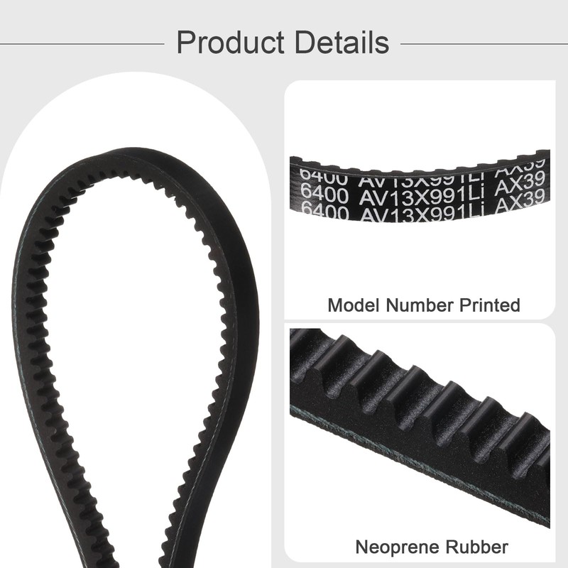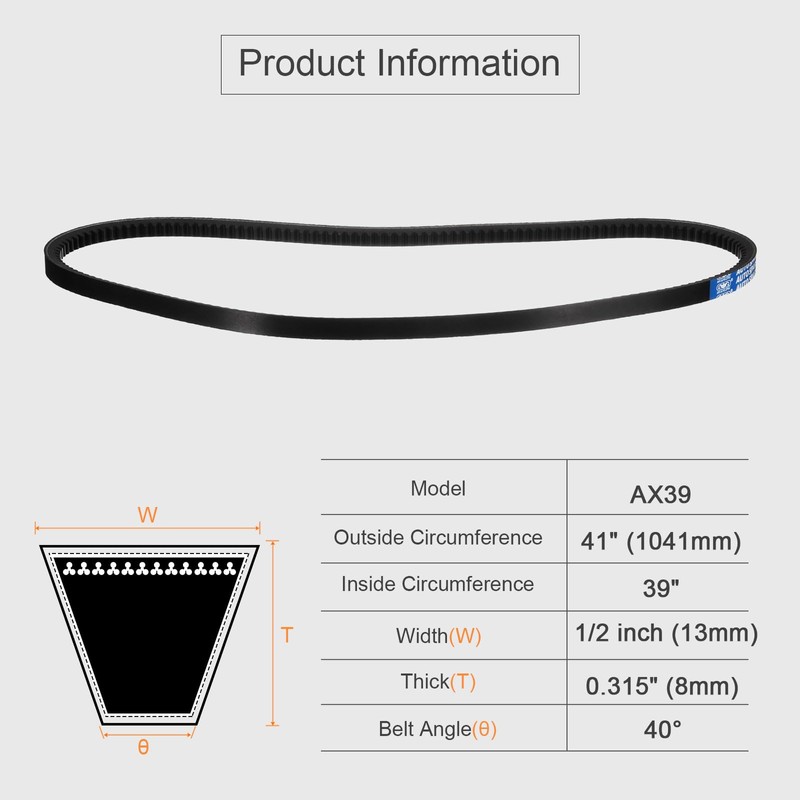 - Size - AX39 Classic Cogged V-Belt, Inside Circumference: 39 inch x Outside Circumference: 41 inch (1041mm) x Width: 1/2 inch (13mm) x Thickness: 0.315 inch (8mm)