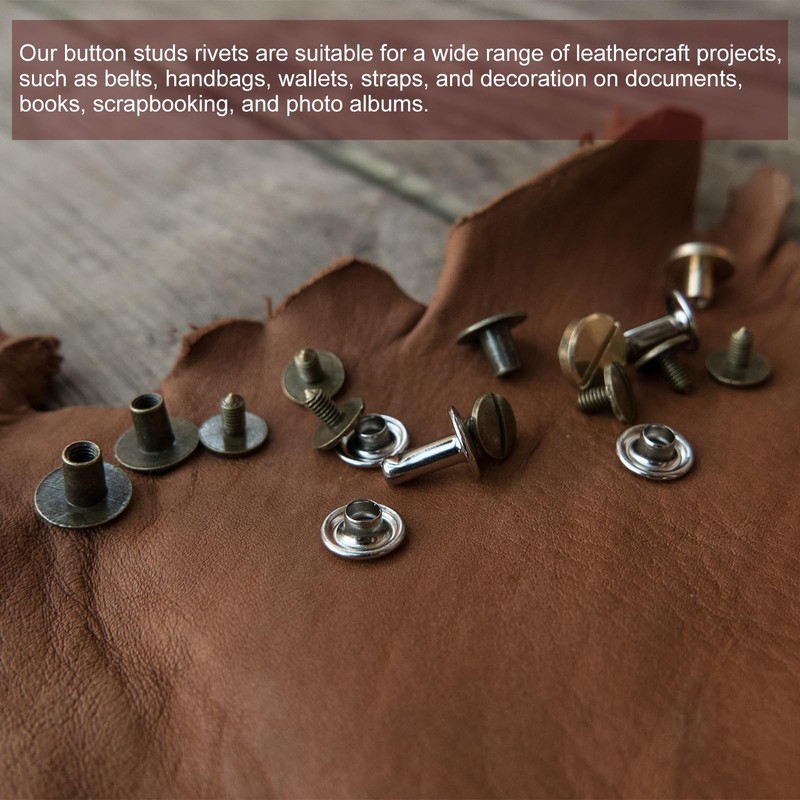 - [Versatile Application] - Our button studs rivets are suitable for a wide range of leathercraft projects, such as belts, handbags, wallets, straps, and decoration on documents, books, scrapbooking, and photo albums. These versatile rivets provide a stylish and functional solution for joining leather components or others together.