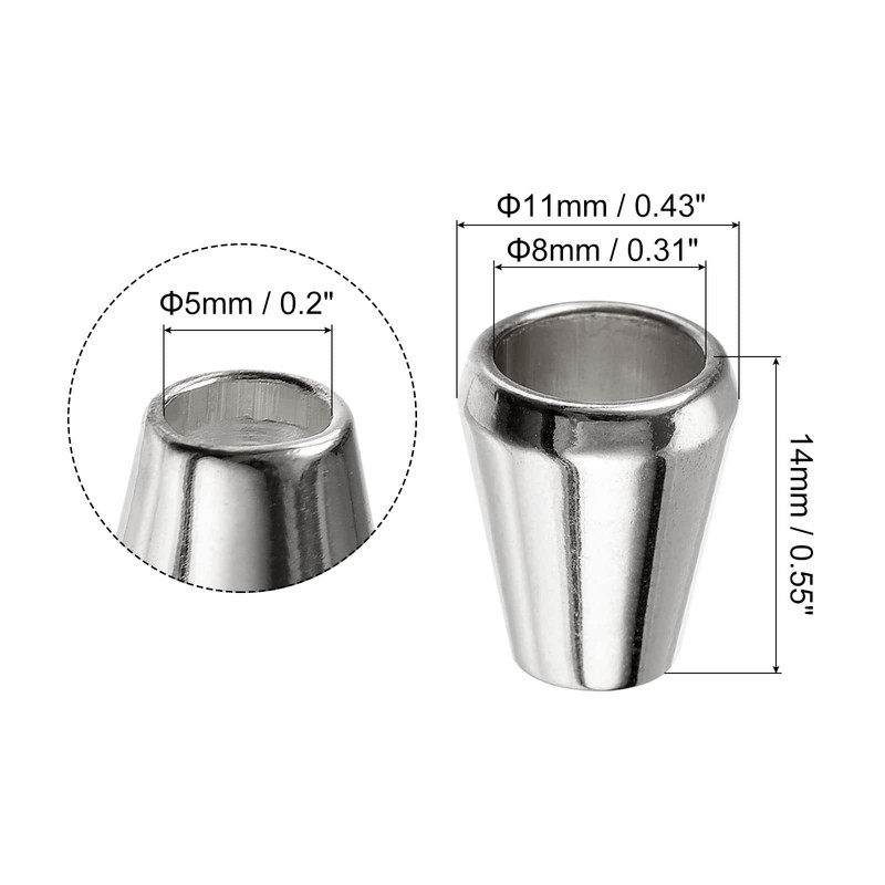 - [Rope Locks Fastener] - The package comes with 30pcs of silver metal bell stopper in 8mm/0.31" large hole dia., 5mm/0.2" small hole dia. and 11mmx14mm/0.43"x0.55" width and height that can meet your daily needs.