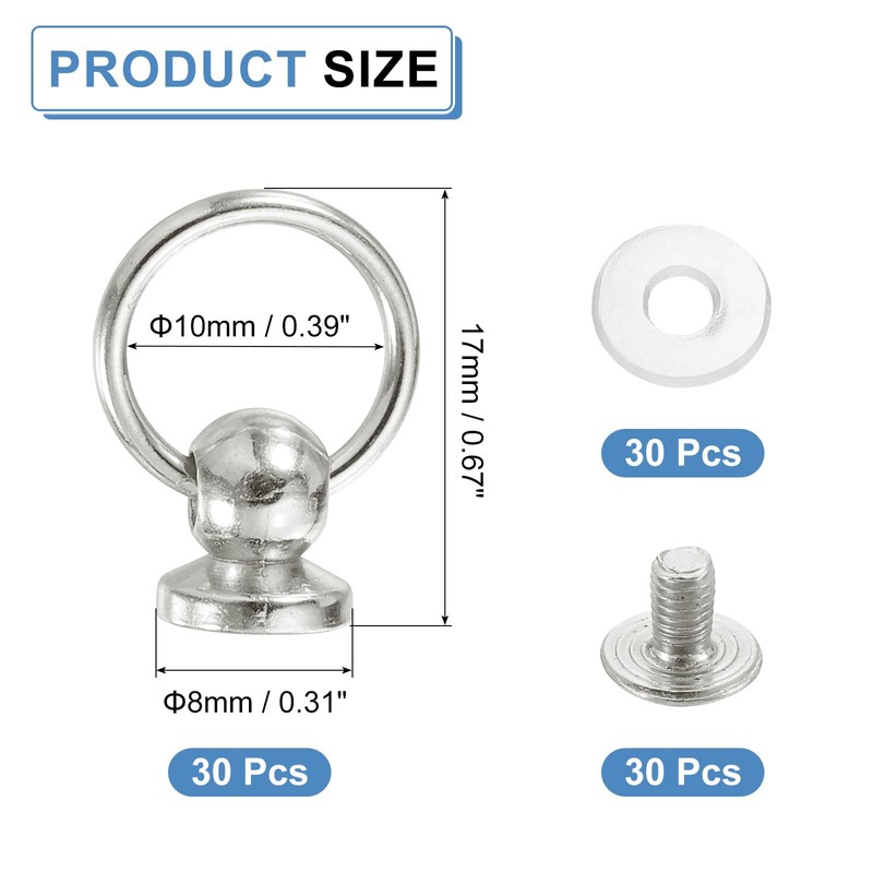 - Colour: Silver; Material: Alloy; Base Diameter: 8mm / 0.31"; Rivet Inner Diameter: 10mm / 0.39"; Rivet Height: 17mm / 0.67"; Package Content: 30Pcs x Ring Head, 30Pcs x Flat Head Screw, 30Pcs x Plastic Washer