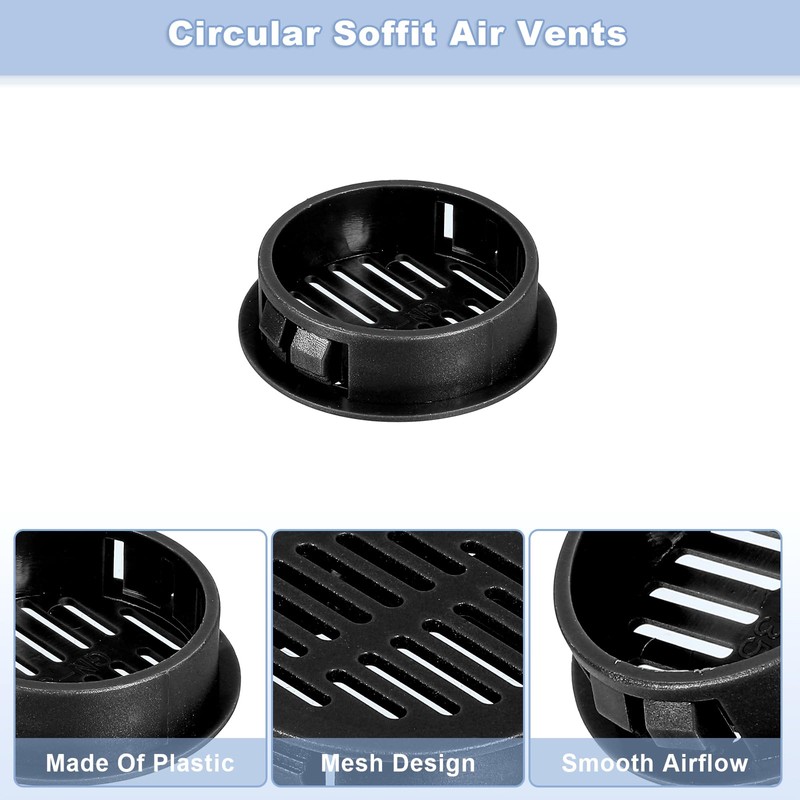 • Color: Black; Material: Plastic; Outside Diameter: 35mm / 1.38"; Bottom Diameter: 39.5mm / 1.56"; Mounting Height: 11.5mm / 0.45"; Package Content: 36Pcs x Circular Soffit Air Vents