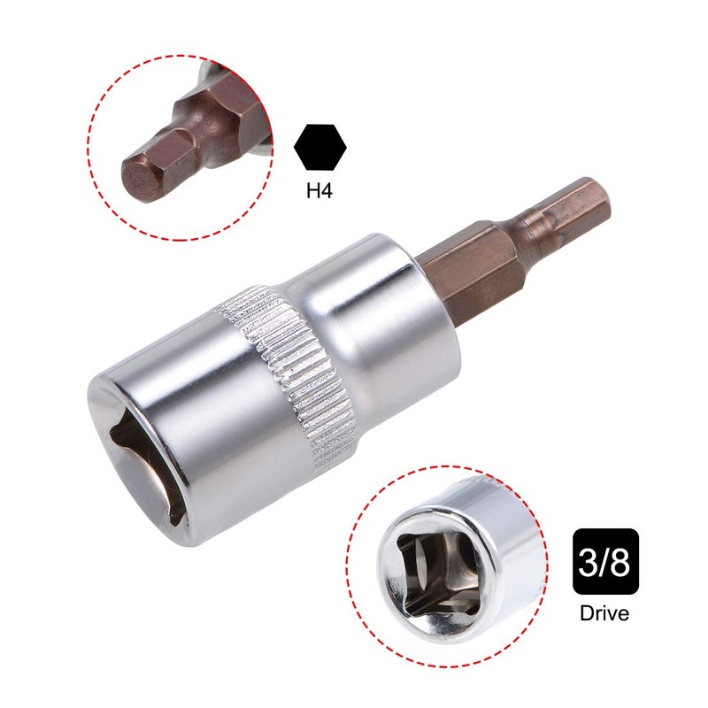- [Size] - 3/8 inch square drive socket, H4 (4mm) hex bit, 1.5 inch (38mm) total length.