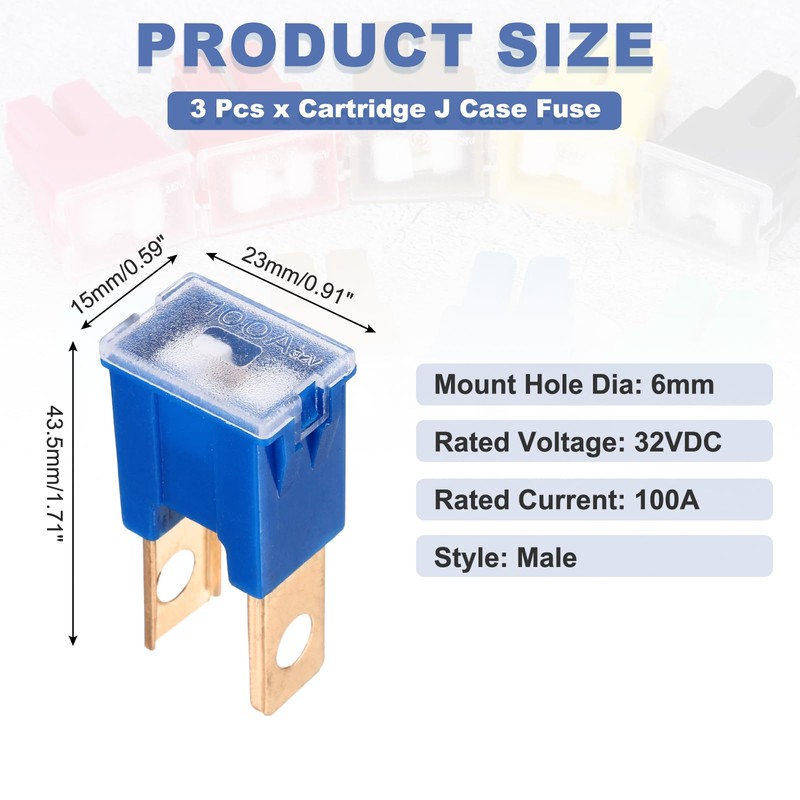 - Automotive J Case Fuses: Size: 23 x 15 x 43.5 mm / 0.91 x 0.59 x 1.71 inch (L x W x H); Pin Size: 18 x 12 mm / 0.71 x 0.47 inch; Mount Hole Dia: 6mm / 0.24 inch; Rated Voltage: 32VDC; Rated Current: 100A; Style: Male; Color: Dark Blue;