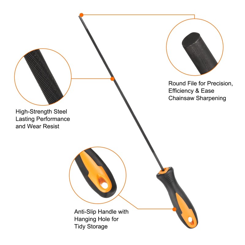 • Features - Ergonomic anti-slip plastic handle provides superior comfort, improving sharpening efficiency while maximizing control and accuracy. Its streamlined design promotes efficient filing, reducing effort and enhancing the chainsaw's cutting power. Includes a convenient hanging hole for tidy storage.