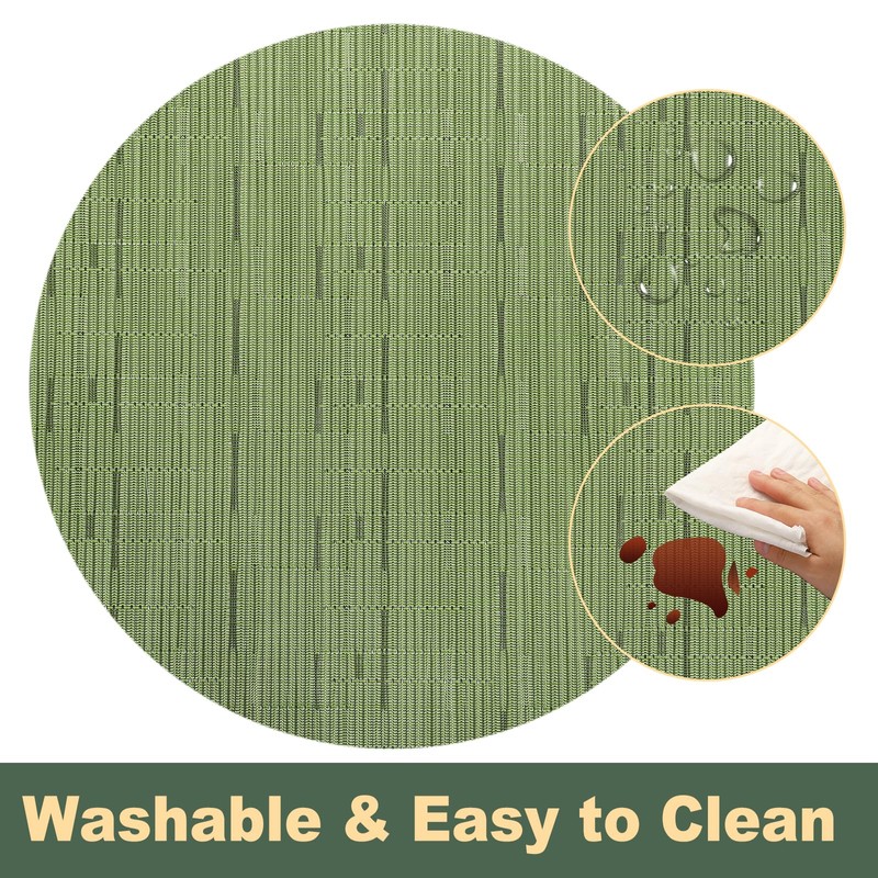 - FEATURE : The textured backing of the round placemats has an excellent non-slip grip, ensuring that your cups or drinks remain stable on any tabletop. They have excellent thermal insulation properties, protecting your table from heat damage caused by hot food and hot drinks, and also protecting your table from spills.