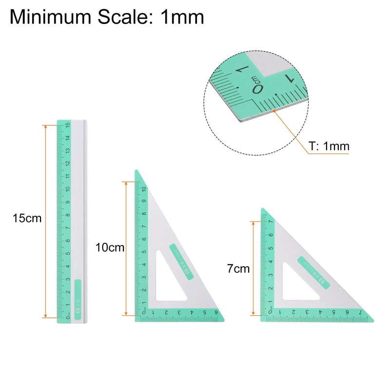 - Size: 15 cm flat ruler. 10 cm and 7 cm triangle. 180° protractor The two have a 1 mm pitch. Suitable size and easy to use.