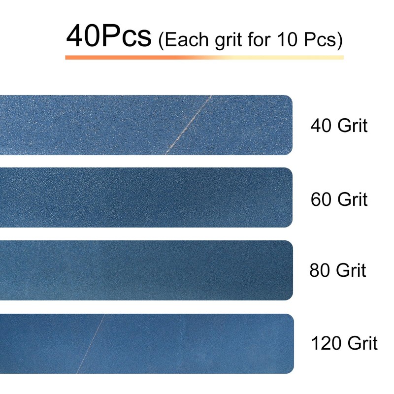 - Package Content - The total number is 40pcs Sanding Belts (10pcs of each grit: 40/60/80/120)