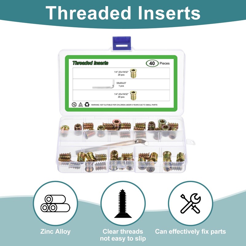 sourcing map 40Pcs 1/4"-20x19/32" Threaded Inserts Nuts, Zinc Alloy Hex Socket Drive Screw-in Nut Threaded Inserts with 1Pcs Hex Wrench, Wood Inserts Bolt Assortment Kit for Wood Furniture