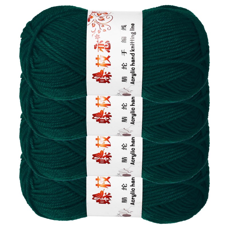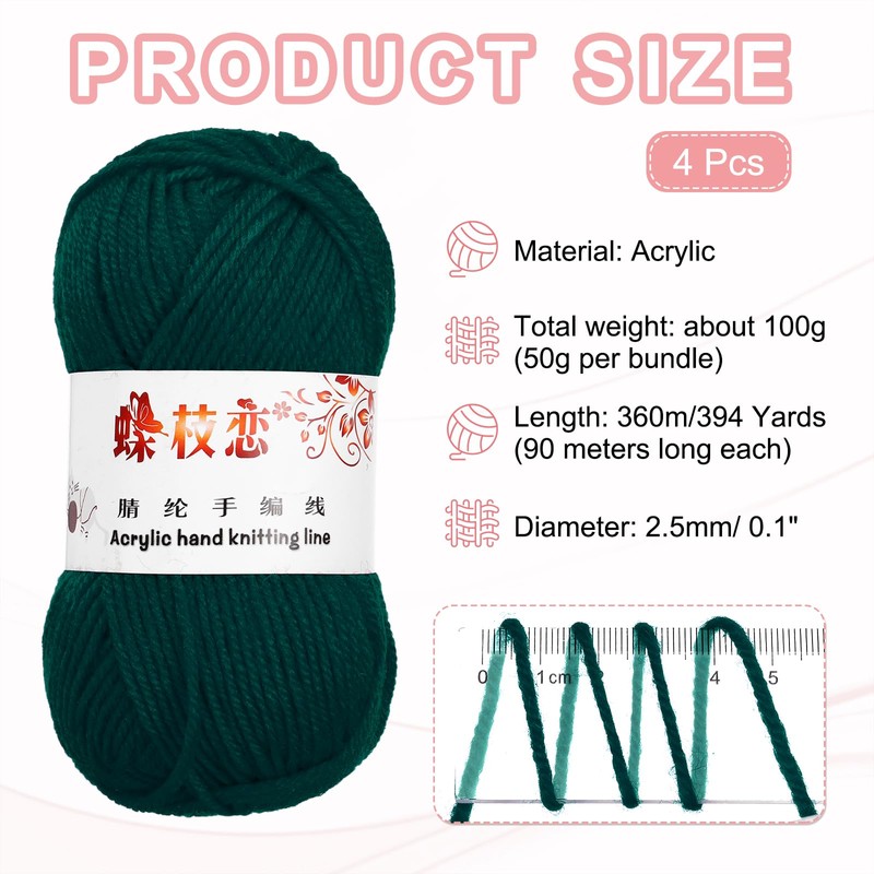 - Soft Crochet Yarn; Color: Ink Green; Size: Diameter: 2.5mm/ 0.1 inch; Total Length: 360m/393.7 Yards(90 meters each roll); Total weight: about 200; Material: Acrylic; Number of strands: 4 layers; Inside the package: 4 pieces x Fluffy Warm Yarn
