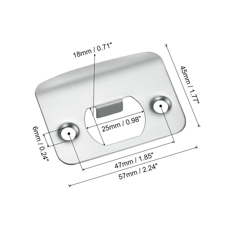 - [Strike Plate Size] - The Package contains 4 pcs door strike plates with 57mm x 45mm/2.24" x 1.77"(L*W) in overall size, 1mm/0.04" in thickness, and 25mm x 18mm/0.98" x 0.71"(L*W) in deadbolt hole size.