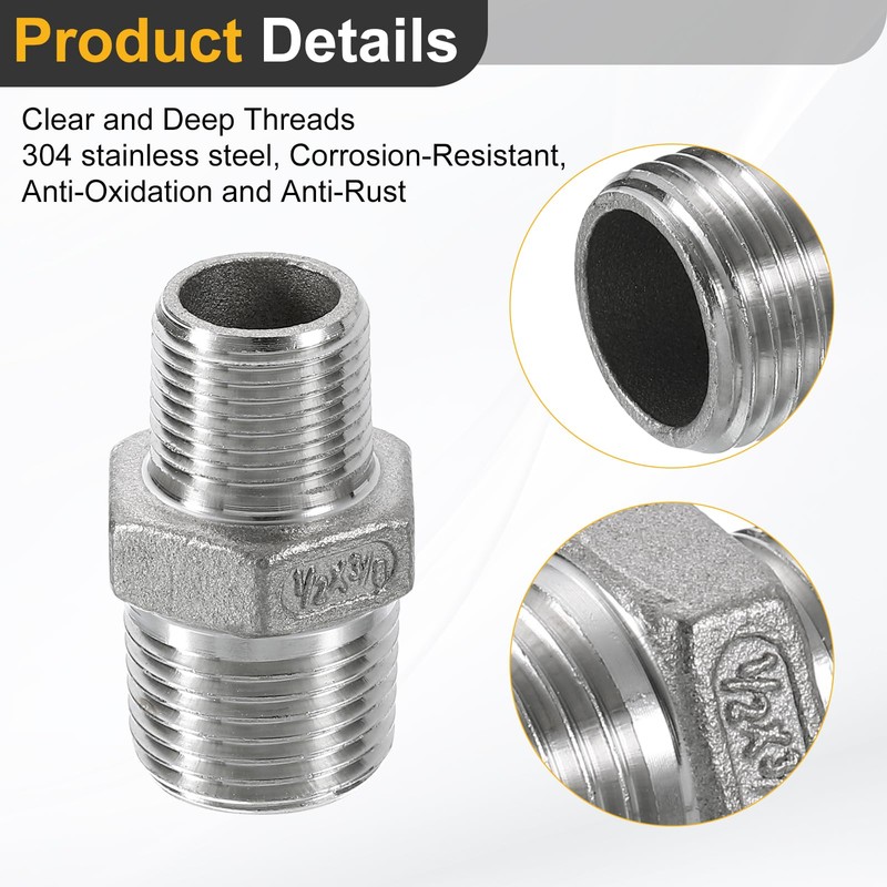 sourcing map 4Pcs PT1/2 x PT3/8 304 Stainless Steel Pipe Fitting Reducing Hex Nipple, Threaded Pipe Fitting Reducer Straight Connector Adapter for Water, Gas, Oil Pipelines